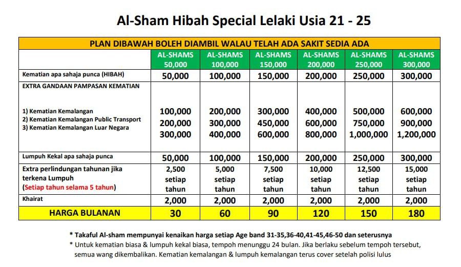 Takaful Al Shams direka khas untuk mereka yang sudah berpenyakit inginkan hibah takaful. Pemeriksaan kesihatan tidak diperlukan kerana plan hibah takaful ni memang khas untuk mereka yang sedang menghidap pelbagai penyakit. Menariknya plan hibah takaful ni melindungi kematian disebabkan oleh penyakit sedia ada. Contoh, sudah menghidap penyakit jantung, dan meninggal dunia, waris layak dapat pampasan sehingga RM 300,000. Banyangkan kalau meninggal ketika masih dalam rawatan di IJN, duit tu boleh digunakan untuk membayar baki kos rawatan jantung.