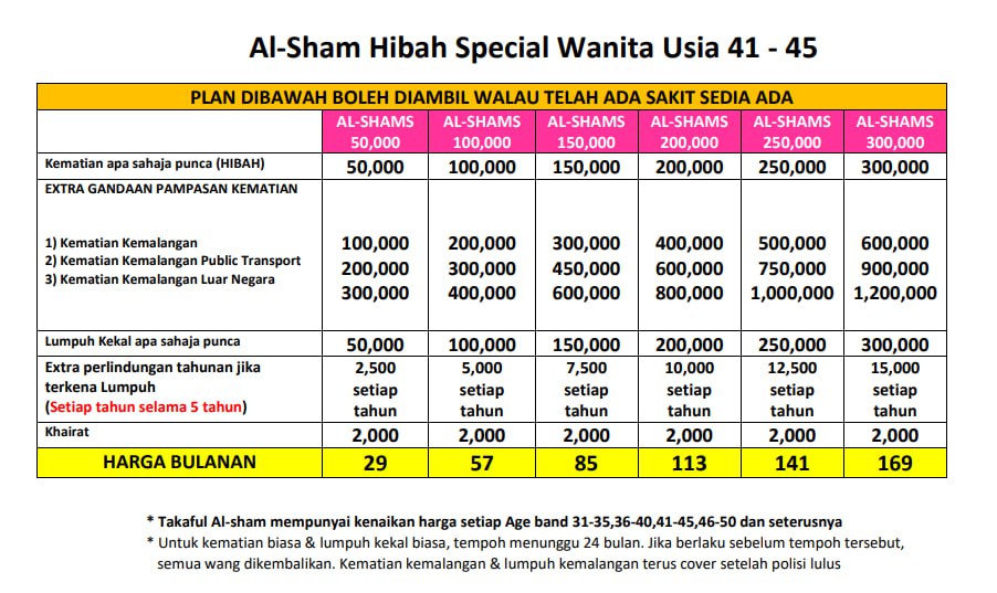 Manfaat kelumpuhan juga dilindungi syarat bukan berpunca dari penyakit sedia ada. Contoh usia 41-45 jadual manfaat di bawah mengikut jantina: