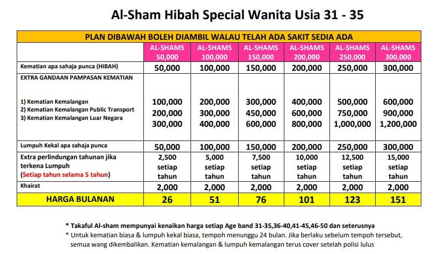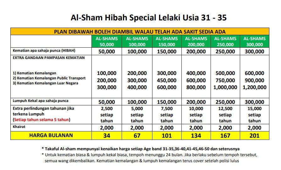 Walaupun dah menghidap penyakit jantung masih berpeluang ambil hibah takaful. Benar, Takaful Al-Shams ialah pelan hibah takaful khas untuk pesakit jantung. Pemeriksaan kesihatan tidak diperlukan kerana plan hibah takaful ini khas untuk golongan berpenyakit. Kematian disebabkan penyakit jantung juga dibayar pampasan syarat sudah mencarum genap 2 tahun. Jika meninggal akibat penyakit jantung sebelum 2 tahun, semua caruman dipulangkan. Khairat kematian juga diberikan
